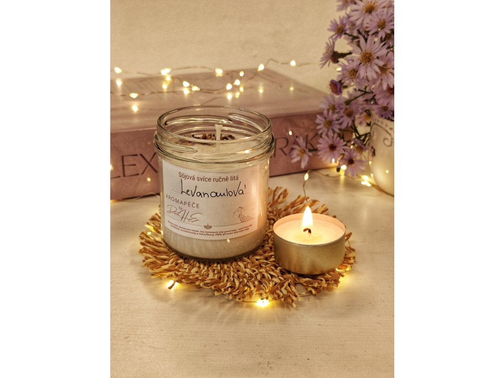 Aromaterapeutická svíčka s éterickým olejem z levandule.